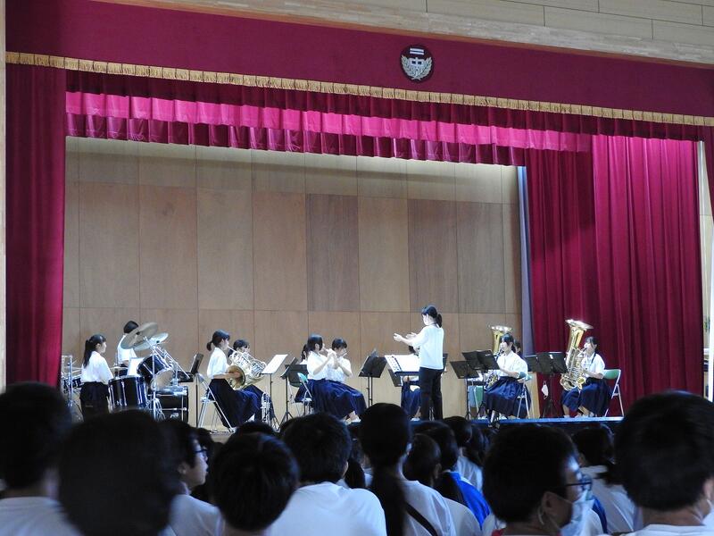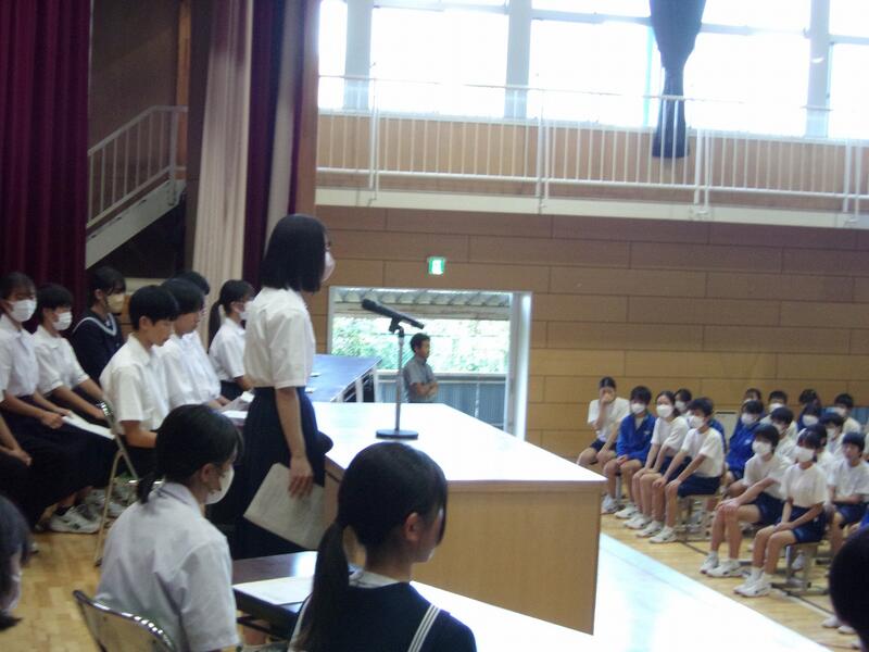 7月7日(金)に部活動壮行会が行われました。3年ぶりに全校生徒が体育館に集まって行うことができました。各部の大会・コンクール・発表会の日程や意気込みを聞くことができました。応援団を中心に、手拍子やひな壇を作るなどしてみんなで応援しました。みんなの気持ちが一つになり、大会・コンクール・発表会にむかいました。