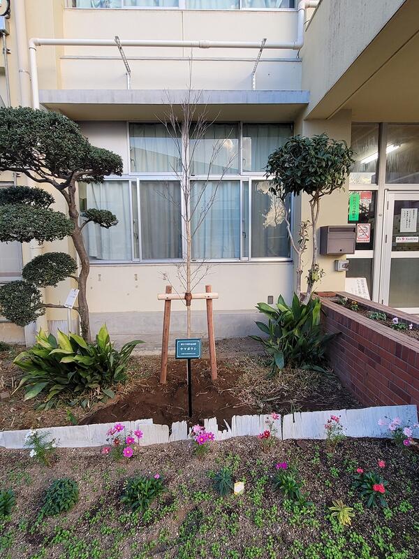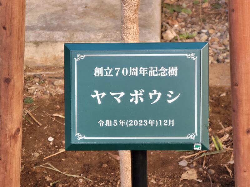 70周年記念行事としてヤマボウシを植えましまた。新旧の生徒会の皆さんと校長先生で植樹を行いました。ヤマボウシの花言葉は「友情」です。いつまでも大事に育ててほしいと思います。