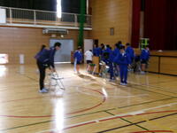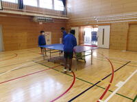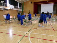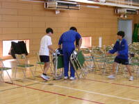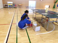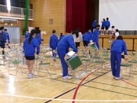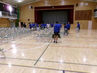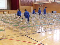 1年生が準備した後は,清掃活動の時間になり,体育館清掃を担当している2年生が,椅子と椅子の間隔や縦・横列の修正,資料を置く卓球台3台の準備と保護者説明会の資料を,設置した卓球台の上に置いてくれました。