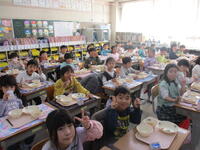 今日は,待ちに待った給食が始まる日です。本日は,豚丼,ごぼうの唐揚げ,フルーツサイダーポンチ,いり大豆です。役割を分担して協力して準備,静かに配膳しています。皆が「おいしい」と笑顔で答えてくれました。