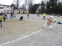 今日の1年生は「ころがしドッジボール」です。内野と外野に分かれ,コートの中の内野を外野が外からボールを転がして当てます。今日は円形コートで攻守交代して楽しんでいました。