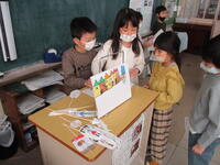 2年生は,生活科の学習で昔の遊びを調べて体験しました。休み時間もみんなで親しんでいます。学習したことは,誰かに伝えたいですよね。そこで1年生に教えてあげるために,グループごとに説明の原稿をつくり「昔遊びの会」に向けて練習をしてきました。