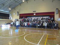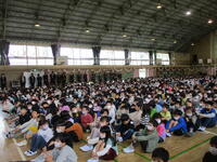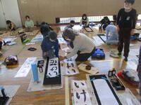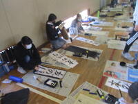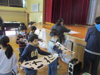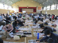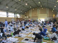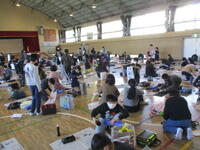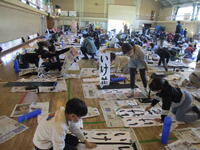 冬休みに練習した字を,体育館で書き上げました。年末に書いた作品よりも上手になっています。練習の成果が表れて,迫力のある作品が多かったです。