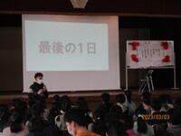 寒い日が続きますが,春は近づいています。樹木は冬芽がふくらみ,つぼみを膨らませる季節です。校長先生からは「新学期に新たなスタートが切れるように,今日という日を大切にしていきましょう」と話がありました。今朝は「まいにちがプレゼント」という本を読んでくださりました。