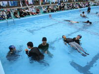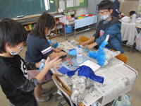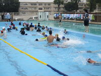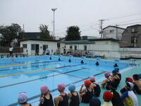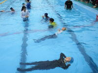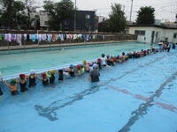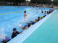 万が一の水難事故に備え,メガロス柏のコーチを招き,着衣水泳の学習を行いました。はじめは着衣のままの歩きや泳ぎを体験し,水の中で浮くことを学びました。いざという時にも慌てないたくましさを身につけました。