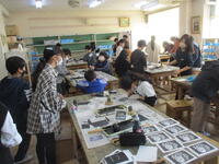 版画家の大野隆司先生をお招きして,彫刻刀の使い方を学びました。実演では,大野先生と言えばおなじみの猫のキャラクターと花を組み合わせた版画を掘っていただきました。それぞれの刃の特徴からできあがる線を知り,自分たちの図案を彫り始めました。