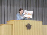 2,5年の代表児童からは,1学期に頑張ったことの発表がありました。全校児童が拍手で頑張りをたたえました。また「ひばり」の公式キャラクターも決まりました