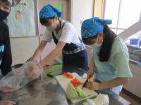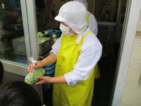 バックヤードでは,鮮魚,精肉,惣菜,パン,野菜と,特別な機械や倉庫を見せていただきました。それぞれの場所で,調理している人や梱包している人など,たくさんの人たちのおかげであることに気づきました。お客様の喜ぶ顔を見たときが一番嬉しいと,店長さんは話していました。