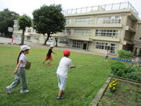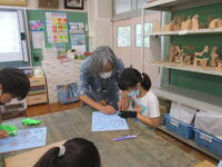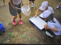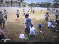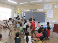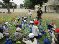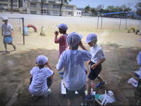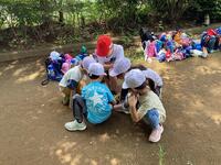夏と仲良しになるためのたくさんの体験をしています。今回は,シャボン玉遊びです。様々な形や大きさのものを使って,たくさんのシャボン玉が大空に浮かびました。