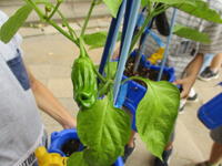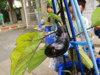 一人一鉢で,夏野菜を育てています。暑い日が続いていますが,毎日欠かさずお水をあげています。かわいらしい実も育っています。収穫が楽しみですね。