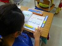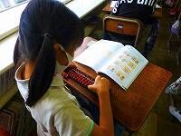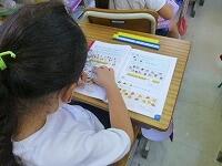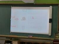 実物投影機で拡大したプリントで,アルファベットを確かめながら練習しています。「nとhは間違えやすいから気をつけましょう。」ローマ字で書けるものが増えて,嬉しそうな3年生。生活の中で使えるようにしていきましょう。
