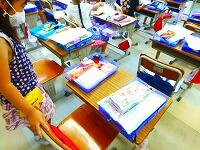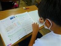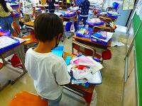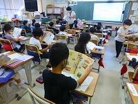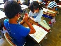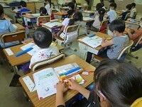 久しぶりの教室では,新しい教科書が配られました。夏休みの出来事でクイズ大会をしている学級,係決めをしている学級,どの教室も子供達の笑顔があふれています。