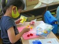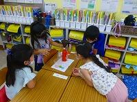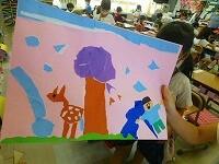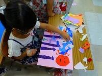 「これは海の中だよ。」ちぎった紙の形や色から,様々な物語を想像しています。形の組み合わせを工夫する子,貼ってからテーマを決める子。みんな生き生きと活動しています。
