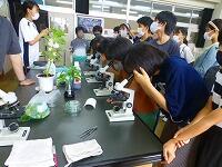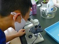 顕微鏡で,花粉のようすを観察しました。拡大した花粉の形や色に,興味津々の5年生です。