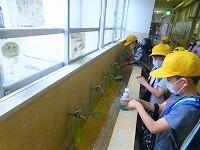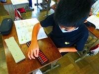 1年生は算数で,「水のかさ」の比べ方を学習しています。形の違う2つのペットボトルを使って色水を入れ替えることで,どちらが多いかを体験しました。