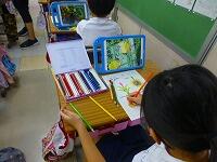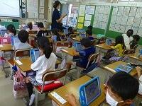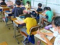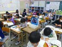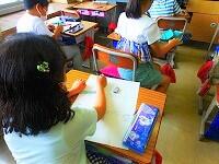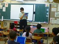 2年生は,夏休みの楽しかった出来事を作文にして,友だちの前で発表しています。お休みの友だちにも聞いてもらうために,タブレットPCで音声だけを配信していました。お休みの友だちの発表も聞けましたよ。
