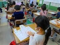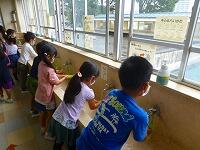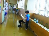 登校して来た児童は,昇降口前で体温と体調のチェックをしています。教室に入る前には,しっかり手洗い。アルコール消毒もしています。マスク着用と手洗いの習慣は,しっかりついているようです。