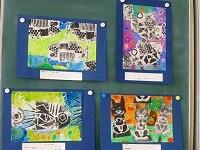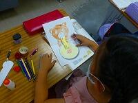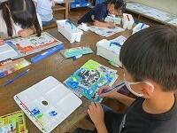 版画の作品の周りにクレヨンで絵を描き,背景等を絵の具で塗っています。版画のイメージをふくらませて,海の中や草原を表現する子供達。みんな夢中で描いています。
