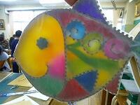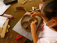 前回は枠となるダンボールを切っていることをお伝えしましたが,今回は切った段ボールを思い思いの形に曲げたり重ねたりしている様子をお伝えします。犬や猫,クラゲやハートマークなど,自分の好きな形を作っています。まだ色はつけていませんが,光の加減で,なんとも幻想的な形が浮かび上がっています。