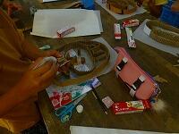 出来上がりは真ん中の写真のようになります。今は土台となるダンボールを切り出しています。既製品を使えば簡単ですが,基礎基本となる技能を育てるために,部材づくりから取り組みます。