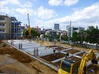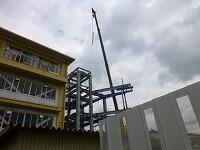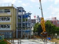 既存の校舎と新築校舎をつなぐ通路の骨組みが,出来上がりつつあります。太い鉄骨が立ち上がっている様子は,迫力があります。