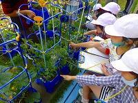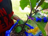 2年生が育てている野菜が,ぐんぐん育っています。ミニトマトは緑の小さな実を付け始め,ナスにも紫色のきれいな花が咲いています。今年は暖かい日が続いているためか,生育状況も良いようです。