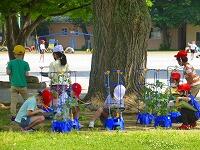 1年生が植えたアサガオがぐんぐん育ち,立派な葉を広げています。日課になった水やりも,忘れずにしています。