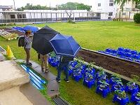 雨の帰り道,何人もの2年生が鉢植えの野菜の様子を見に来ています。ミニトマト・ピーマン・ナス・キュウリ,自分の選んだ野菜がどれだけ育ったか,気になるようです。「花が咲いてるよ。」「○○ちゃんの大きいなあ。」毎日水やりをし,大切に育てているので,立派な野菜が実ることでしょう。
