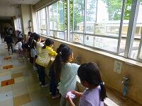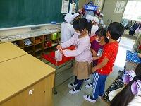 1年生は,今日から給食が始まりました。まず,きれいに手を洗って,消毒も念入りに。