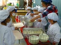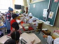 アレルギーのある子の次は給食当番の分を配膳します。先生に1食分の量を教えてもらいながら盛り付けをしました。