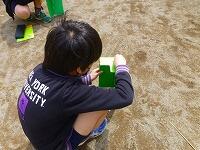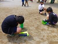 4年生が校庭で,日向と日陰の温度を測っています。曇っていると差がでませんし,風が強いと覆いが飛ばされてしまうので,天気に敏感にならないとできない観察です。