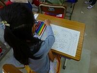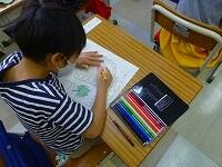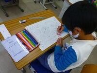 文字を丁寧に書く練習として,いろいろな線をなぞっています。みんな一言もしゃべらず,真剣に点線をなぞっていました。早くかけた子は,きれいに色を塗る練習もしています。学習態度がとても良いですね。