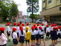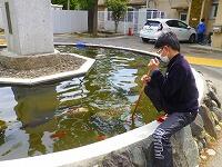 今日は校庭の遊具や施設の場所,使い方を確かめています。丸池では,美化委員会のお兄さんが掃除をしていましたよ。