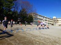 寒さをものともせず,元気な3年生が体育をしています。ハードルの基礎練習では,歩数を合わせて飛ぶ感覚を養っています。短縄跳びも上手です。