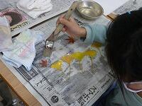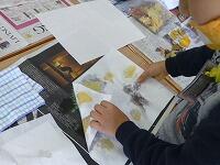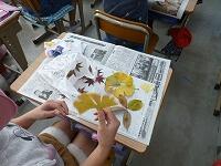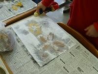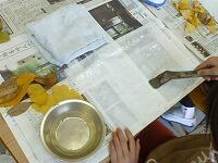 落ち葉の上からも水のりを塗って,もう一枚の半紙ではさんでしっかりと押さえます。