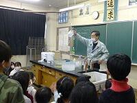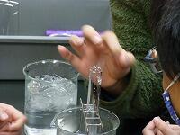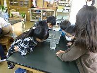 理科の学習で,空気と水の体積が温度によってどのように変化するのかを実験しています。理科教育支援員が,栓をしたペットボトルをお湯に漬けると「ポン!」という音と共に栓が勢いよく飛び,子どもたちからは「おー!」という歓声と拍手が起きていました。その後,口にシャボン玉液を付けた試験管を,氷水とお湯に漬けてシャボンの膜の変化を観察しました。知識として知っている子は何人もいたようですが,目を輝かせて見つめる姿に,体験することの大切さを改めて感じた授業でした。