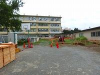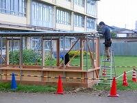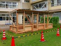 このところの雨で工事も思うように進まないようですが,悪天候の中作業をしてくださっている工事関係者の皆さんには,頭が下がります。第3校舎への通路付近には様々な資材が運び込まれ,本格的な工事の準備にかかっています。ウサギの仮住まいは柱や屋根が取り付けられ,飼育小屋らしい姿になってきました。完成は来週くらいになりそうです。