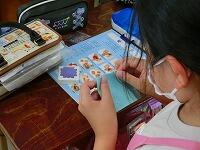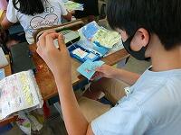 型紙にインクを付けて,紙を重ねて「バレン」でこするとあら不思議。かわいい魚や亀が現れました。工夫した模様がはっきり分かるように,ローラーで細かい所までしっかりとインクを付けている子がいます。バレンだけではなく,指や手のひらも使って,一心不乱に紙をこすっている子もいます。みんなとっても楽しそう。素敵な作品ができると良いですね。