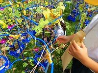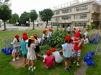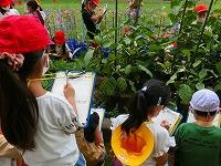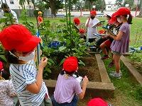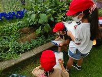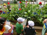 「うわ!大きいのがあった!」「これ何?」「キュウリでしょ。」普段食卓や店先では見ているはずの野菜達ですが,実際になっているのを見るのは新鮮な体験だったようです。先生の「触ってみて良いですよ。」の声に,「この葉っぱ,ザラザラしてるよ。」「ギザギザだね。」「こんな風になってるんだ。」と真剣な表情で観察記録をつけています。