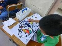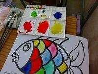 始めに筆の洗い方やパレットの使い方を確かめて,輪郭だけの魚に好きな色を塗りました。
