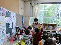 1年生は,折り紙で飾りを作っています。折り重ねた紙の一部を切り取って広げると,様々な模様ができあがりました。「これテントウムシみたいだね。」「え?適当に切ったんだよ。」可愛らしい会話も聞こえてきます。