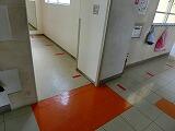 学校では,新型コロナウイルス感染防止のため,様々な取り組みをしています。今日は,その中からいくつかを紹介します。1つ目は「手洗いやトイレでは,間隔をあける。」ことです。蛇口は1つ置きに使い,床には目安となるテープをはっています。2つ目は,「給食当番はマスクとフェイスシールドを着用する。」ことです。当番それぞれに専用のシールドを使用しています。