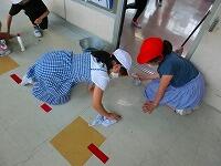 2回目となる今日は,1年生も本格的に参加しました。昨日練習したぞうきんの絞り方を思い出しながら,水拭きに取り組みます。先生が手本を見せながら,掃き方・拭き方をみんなで確かめている学級もあります。「このマス2つが1人分だよ。力を入れて拭こうね。」