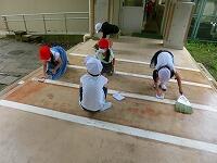廊下では,こびりついた汚れを一生懸命落としています。6年生の教室では,先生も一緒に床掃除です。渡り廊下の清掃も,丁寧に行っています。