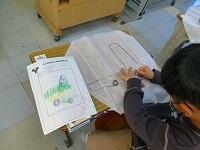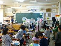 3組では,できあがった凧の発表会です。「うわあ,上手だね。」「色がきれい!」みんな自慢の作品です。早く揚げてみたいですね。