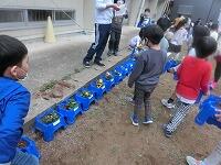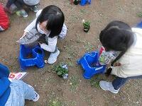 アサガオの観察が終わって空いていた植木鉢に,パンジーとチューリップを植えました。始めに5cmくらい土を入れ,チューリップの球根を置きます。その上から,球根が隠れるくらいに土を足して,重ねるようにパンジーを植えました。春になると,チューリップの根元にパンジーが咲いているという「ミニガーデン」ができるそうです。楽しみですね。