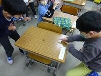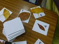 先生に穴を開けてもらったどんぐりで,やじろべえやコマを作って遊んでいる子,落ち葉を紙に貼ってトランプを作る子,皆それぞれに工夫しています。