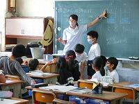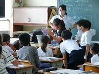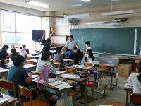 5年生は「分数と小数,整数の関係を調べよう。」の学習で,様々な大きさを分数や小数で表す学習をしています。分数などは図で学習することが多いのですが,平面なので量の感覚がつかみづらい場合もあります。この学級では,透明のマスに水を入れて実際に分ける作業をすることで,量を体感できるよう工夫しています。アナログの良さも生かした学習です。