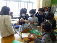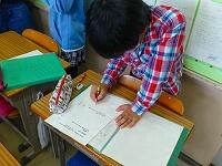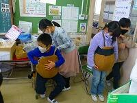 点字・車椅子体験に続いて,「赤ちゃん抱っこ体験・妊婦体験」をしました。赤ちゃん抱っこ体験では,人形とはいえ,ずっしりとしたその重さにみんなびっくり。恐る恐る抱きかかえた子どもたちから,自然と笑みがこぼれます。妊婦体験では,重りを付けて歩いたり,落ちているものを拾ったりしてみました。「重い~。きつすぎるよ~。」「歩きにくい。」「おなかが邪魔で,拾えない。」お母さんの大変さが,少しだけ分かったようです。体験した後は,感想をしっかり記録しています。