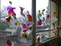 2階の廊下が,とてもカラフルに飾られています。1年生の作品です。セロファンを,切ったり貼ったりねじったり。個性的な顔が並んでいます。